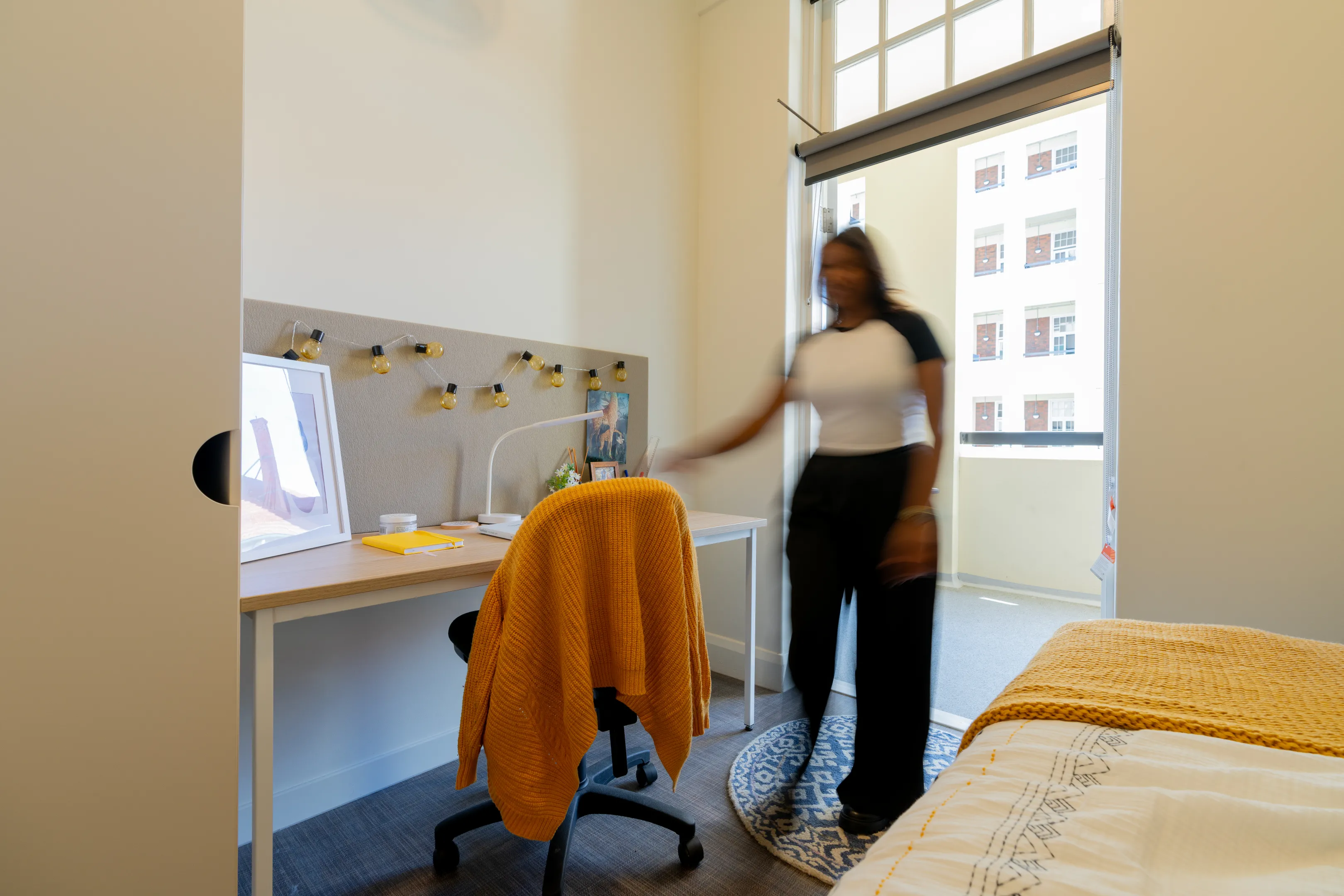 Single Accessible rooms in Lady Lamington are designed for one occupant. Each room is equipped with all the amenities required for comfortable living: a King Single Bed frame and mattress, a wardrobe and a study desk and chair.