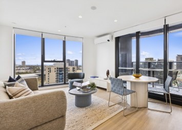Furniture and appliances shown are of display apartment 1607 on Level 16, Floorplan type C02. This apartment listed is unfurnished and the furniture shown is not included. Fixtures, finishes, view lines, layout, and inclusions may vary. Prospective tenants are encouraged to inspect the property to confirm details.