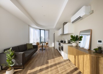 - Kitchen - all apartments are either fitted with a kitchenette (Studios) or multishare apartments are fitted with a fully equipped kitchen (Twin Studios, 3 Bed Ensuite, 4 Bed Ensuite, 5 Bed Ensuite).