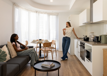 - Kitchen - all apartments are either fitted with a kitchenette (Studios) or multishare apartments are fitted with a fully equipped kitchen (Twin Studios, 3 Bed Ensuite, 4 Bed Ensuite, 5 Bed Ensuite).