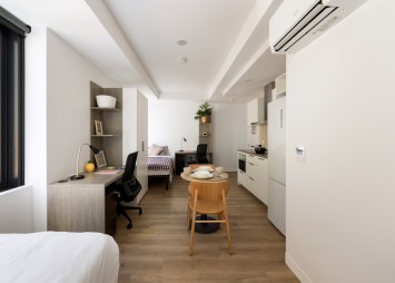 - Kitchen - all apartments are either fitted with a kitchenette (Studios) or multishare apartments are fitted with a fully equipped kitchen (Twin Studios, 3 Bed Ensuite, 4 Bed Ensuite, 5 Bed Ensuite).
