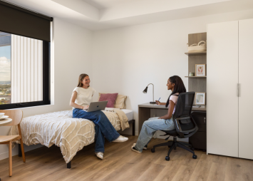 Experience modern, high-floor living between levels 18-29 in our Twin Bed Studio. Each student enjoys their own bed and study space, while sharing a modern kitchenette and ensuite. With extra natural light, panoramic views, and closet storage, this studio combines comfort, convenience, and an elevated perspective.