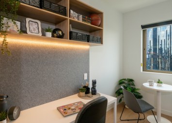 The Deluxe Studio Apartment provides a fully self-contained living experience, perfect for students seeking independence and convenience. Designed with an open-plan layout, each Deluxe Studio Apartment includes a private bathroom, kitchenette with fridge/freezer, microwave, electric stove and storage, queen sized bed and mattress, wardrobe, and study space with desk, chair and light, all finished with calm timber tones and smart lighting. Many Deluxe Studios enjoy natural light and city views, creating a relaxed yet functional space for both study and downtime.