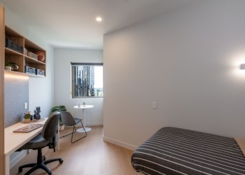Designed with an open-plan layout, each Corner Studio King Single Apartment includes a private bathroom, kitchenette with fridge/freezer, stove and microwave with storage, king single sized bed and mattress, wardrobe, and study space with desk, chair and light, all finished with calm timber tones and smart lighting. This corner layout ensures many apartments enjoy natural light and city views, creating a relaxed yet functional space for both study and downtime.
