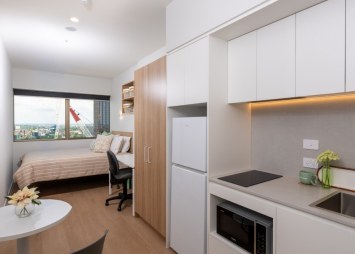 Designed with an open-plan layout, each Studio King Single Apartment includes a private bathroom, kitchenette with fridge/freezer, stove and microwave with storage, king single sized bed and mattress, wardrobe, and study space with desk, chair and light, all finished with calm timber tones and smart lighting. Many Studio King Single Apartments enjoy natural light and city views, creating a relaxed yet functional space for both study and downtime.